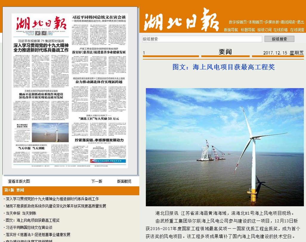 12月13日,2016-2017年度國家工程領(lǐng)域最高獎項(xiàng)——國家優(yōu)質(zhì)工程獎在北京人民大會堂舉行頒獎儀式。國家電投集團(tuán)濱海北H1#100MW海上風(fēng)電項(xiàng)目被授予該獎項(xiàng)最高榮譽(yù)——金質(zhì)獎,成為國內(nèi)風(fēng)電工程(陸上、海上)首個獲得國家優(yōu)質(zhì)工程金質(zhì)獎項(xiàng)目,受到眾多媒體的熱捧。華爾辰海上風(fēng)電公司該項(xiàng)目的參建方,負(fù)責(zé)風(fēng)機(jī)基礎(chǔ)沉樁施工和附屬構(gòu)件安裝,同樣受到多方媒體的宣傳采訪。